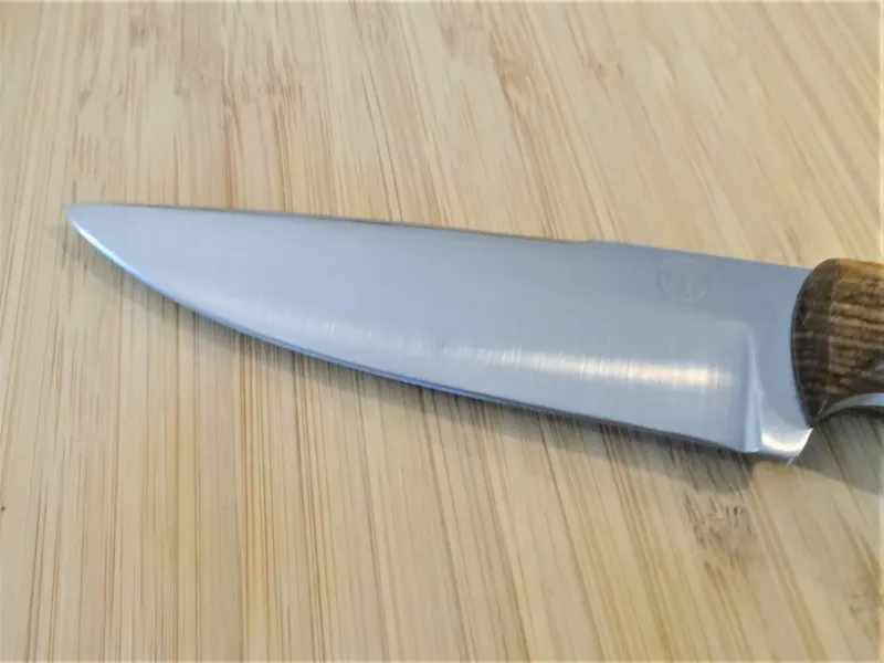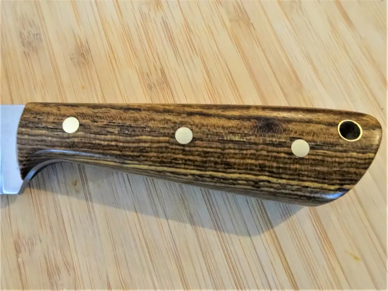 The handle, crafted from richly grained exotic Bocote wood, carries a unique tale. Unlike the stabilized woods typically used by GreBec Knives, Bocote’s high natural oil content resisted stabilization, turning the liquid to jelly under vacuum. Embracing this challenge, Greg left the Bocote unstabilized. Secured with brass pins, the handle offers a classic, ergonomic grip that excels in versatility—perfect for opening packages or preparing camp meals. Its natural texture ensures comfort during extended use, whether you’re tending a campsite or working in the garden.