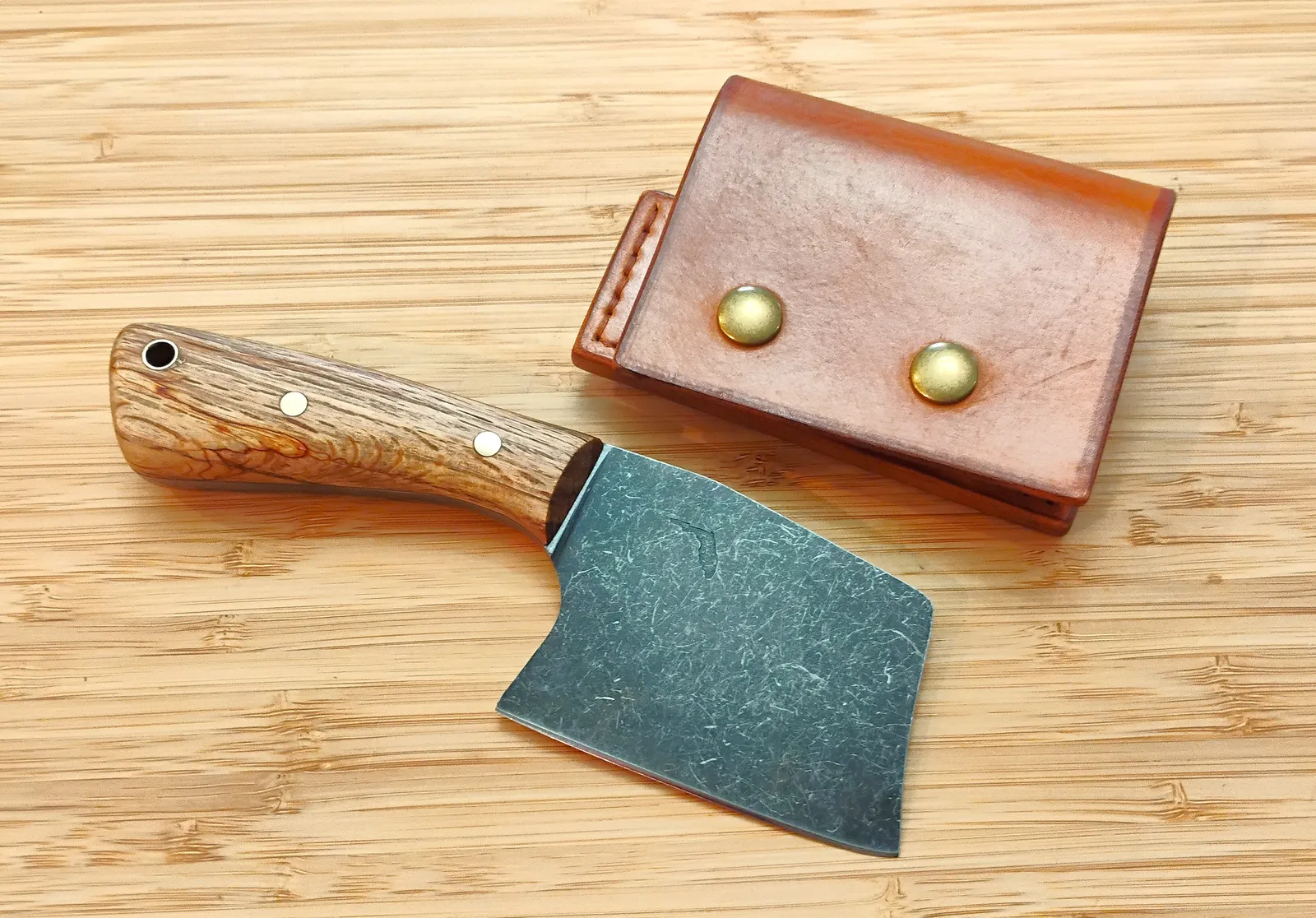 This compact mini cleaver camping knife is designed to do more than its size suggests. It excels in camp kitchens, handles light chopping tasks with ease, and carries comfortably as an EDC fixed blade. The combination of high carbon steel and locally sourced Florida wood makes each piece unique, blending utility with craftsmanship.