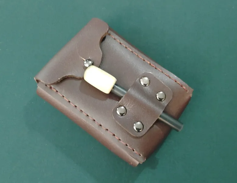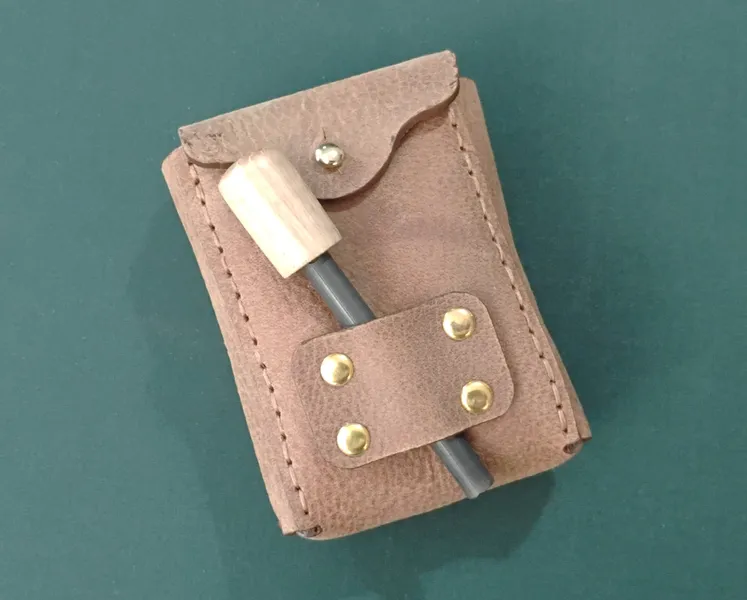 Each kit comes packed in a rugged, hand-stitched leather pouch.  You can choose from the available chrome-tanned leathers, dark brown or tan. A secure button closure will keep your gear safe and ready. Inside a sturdy metal tin, you’ll find  a high-carbon steel striker that makes starting a fire quick and easy. The kit also comes with a high-quality ferro rod that delivers reliable sparks in any weather.  Greg adds his signature touch by crafting each ferro rod topper from stabilized wood sourced from Florida’s downed trees—showcasing the natural beauty and durability of local materials.