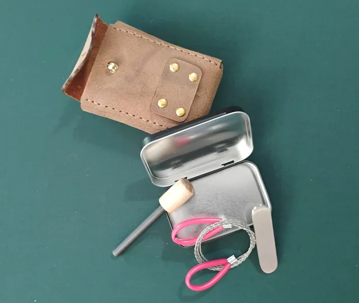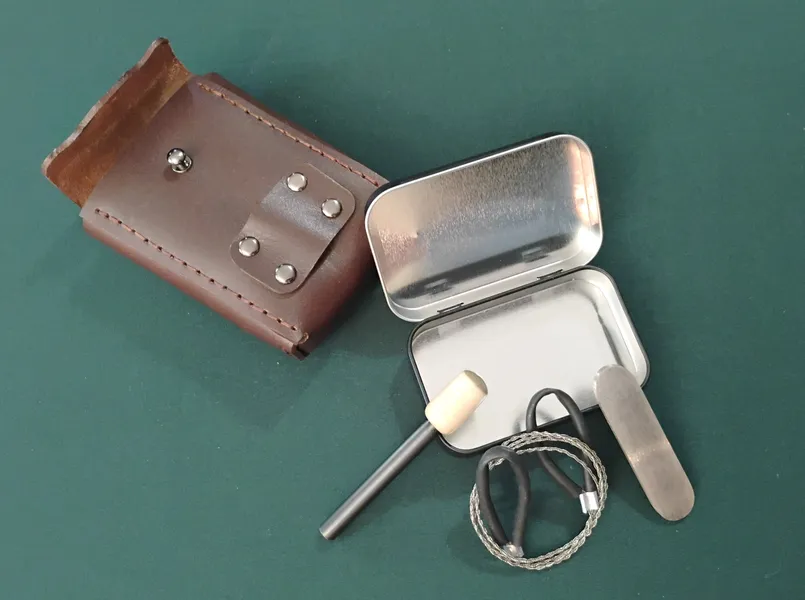 The kit also includes a versatile wire saw for cutting branches or rope, plus a compact tinder box to store your fire-starting materials. The leather pouch features belt loops so you can carry it on your belt or backpack, keeping your essentials close at hand whether you’re deep in the wilderness or prepping for emergencies.