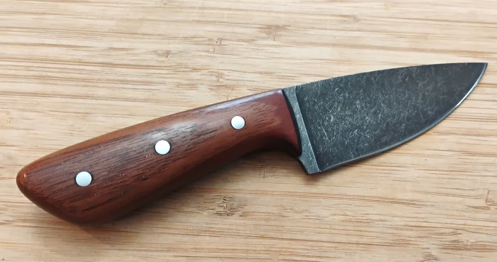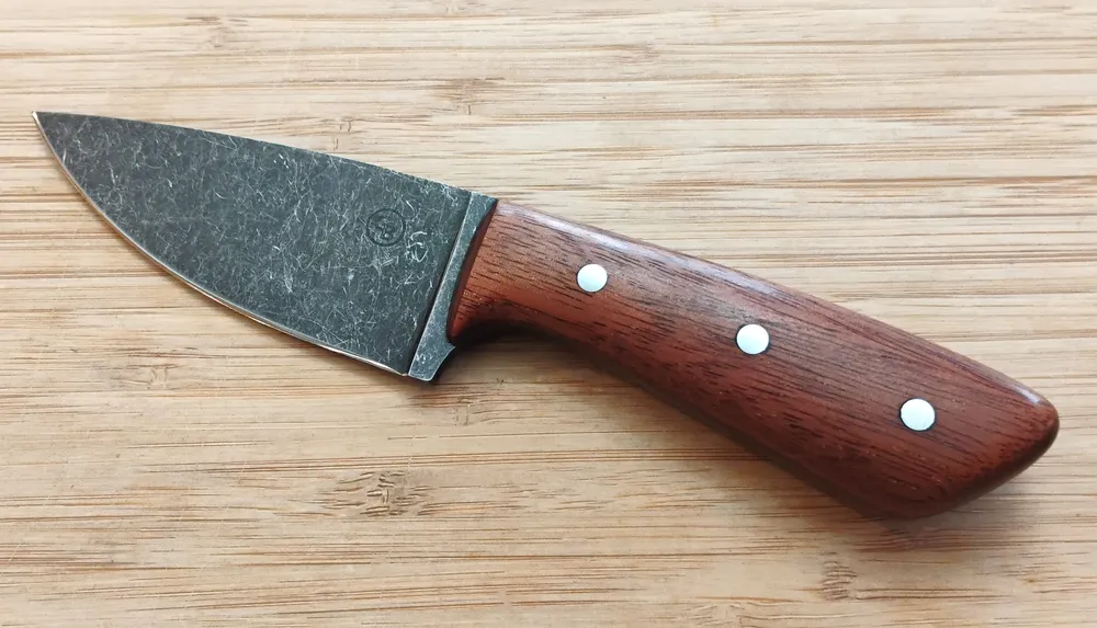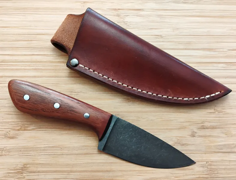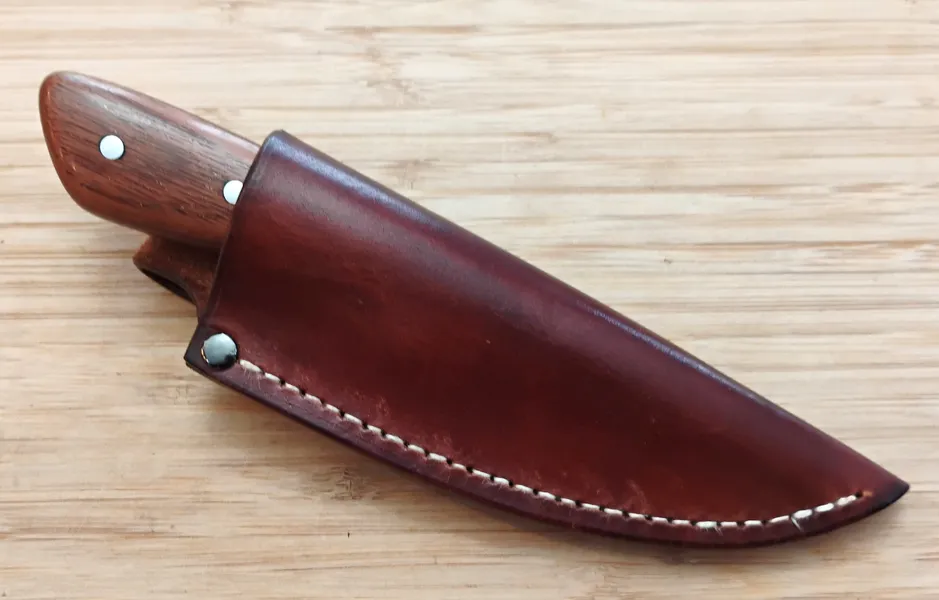 Greg crafts the handle from stabilized cherry, showcasing deep, rich color and a smooth, secure grip that stays comfortable during extended use. Also, mild steel pins lock everything in place, highlighting GreBec Knives’ signature blend of style and practicality. Each knife is handcrafted by Greg, ensuring the quality and detail that define his work. Finally, a custom, hand-cut and dyed leather pouch sheath completes the package for safe storage and easy belt carry.