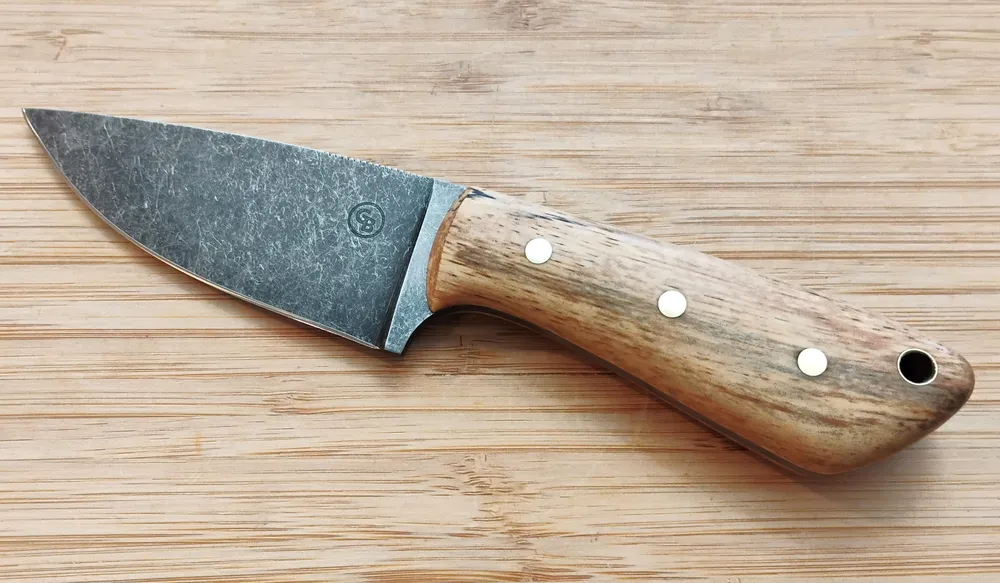 The Pecan 3 Finger Skinner #332 is a handcrafted stonewashed knife from GreBec Knives’ Florida Wood Series, designed for hunters, campers, and outdoor enthusiasts. The stonewashed finish is favored for its ability to hide scratches and imperfections that naturally accumulate over time, making it an ideal choice for knives that will see heavy use.  This 7 1/4″ custom skinning knife is compact yet rugged, making it ideal for field dressing, skinning, or precision cuts in the wild.