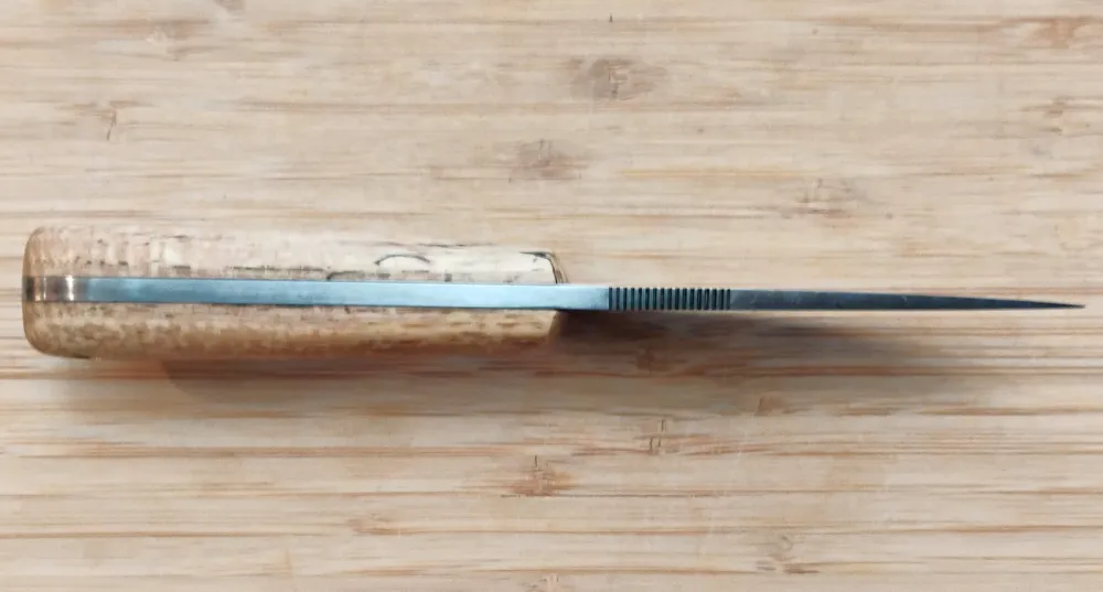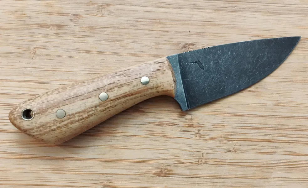 Greg, our Florida-based bladesmith, crafts each blade using high-quality carbon steel. This particular knife features a 5/32″ thick blade—one of the thickest steels Greg uses. In addition, the thickness gives the knife extra strength and durability without sacrificing control, making it perfect for heavy-duty use. The handle is crafted from locally sourced pecan wood, known for its warm grain and natural character. Since Greg harvests the wood himself, each piece is unique. Brass pins secure the handle, and a lanyard tube provides additional carry options. Thumb serrations give a sure grip and excellent control, whether you’re setting up camp in the rain or skinning your next deer.