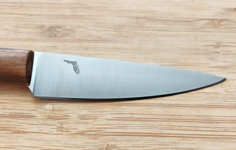 The handle is made from stabilized Florida Pecan, secured with classic brass pins for a comfortable, secure grip that stands up to daily use. Our Florida Wood Series also features unique woods like Red Cedar and Live Oak, each with a story that connects your culinary craft to Florida’s natural heritage. Learn more about this legacy on our Florida Woods Series page.