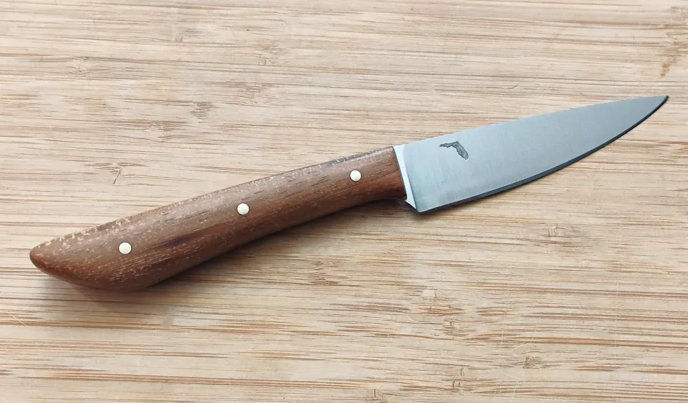 Introducing the Pecan Paring Knife #360 by GreBec Knives — a stunning, handcrafted piece designed for precision and durability in any kitchen. This 8 1/8” paring knife features a 3 7/8” blade forged from 1/16” 1095 high carbon steel. As a result, this knife has a razor-sharp edge and excellent edge retention. The brushed drop point blade style makes it versatile for slicing, trimming, peeling, and detailed prep work. Each blade proudly bears a State of Florida etch, celebrating our Sunshine State roots and commitment to local craftsmanship.