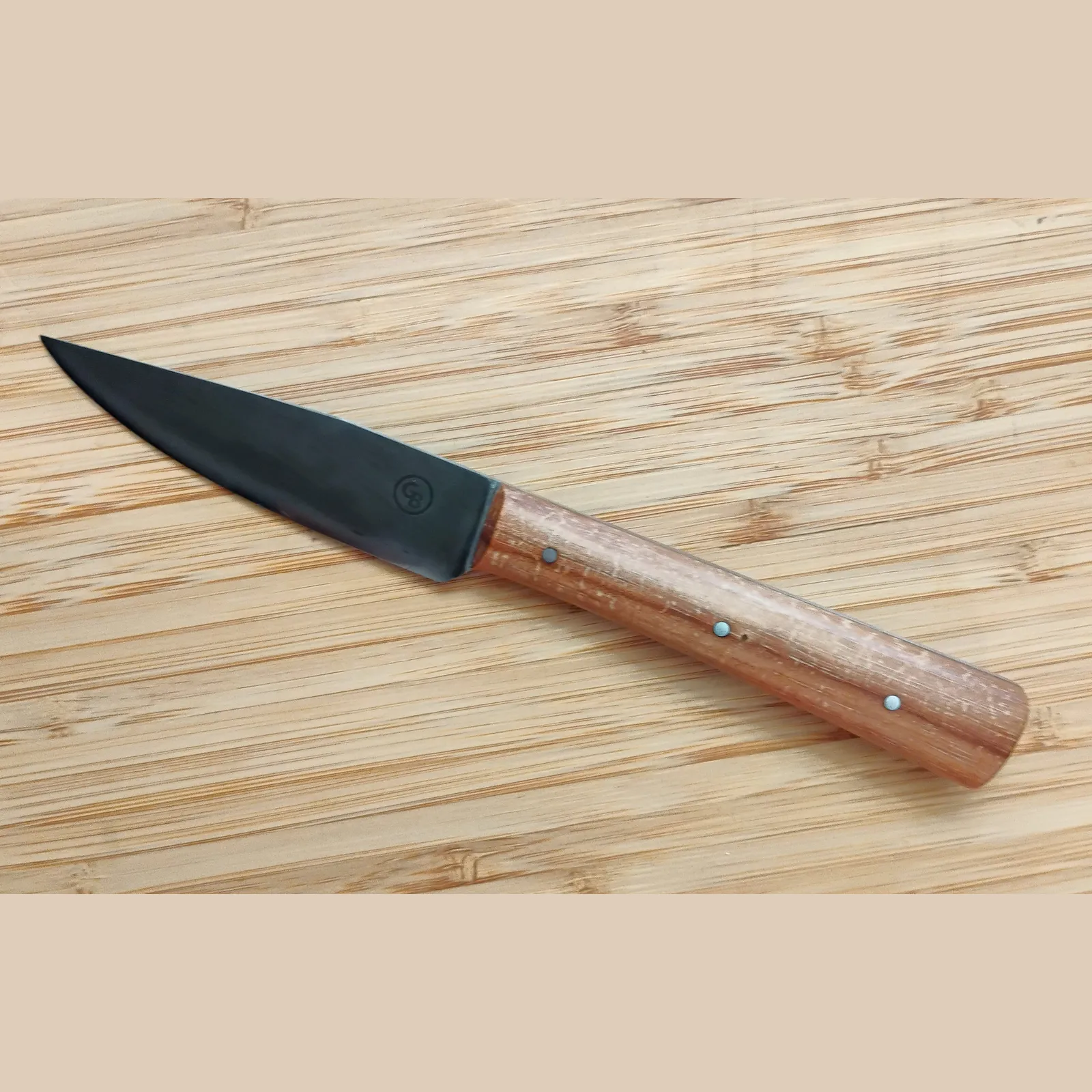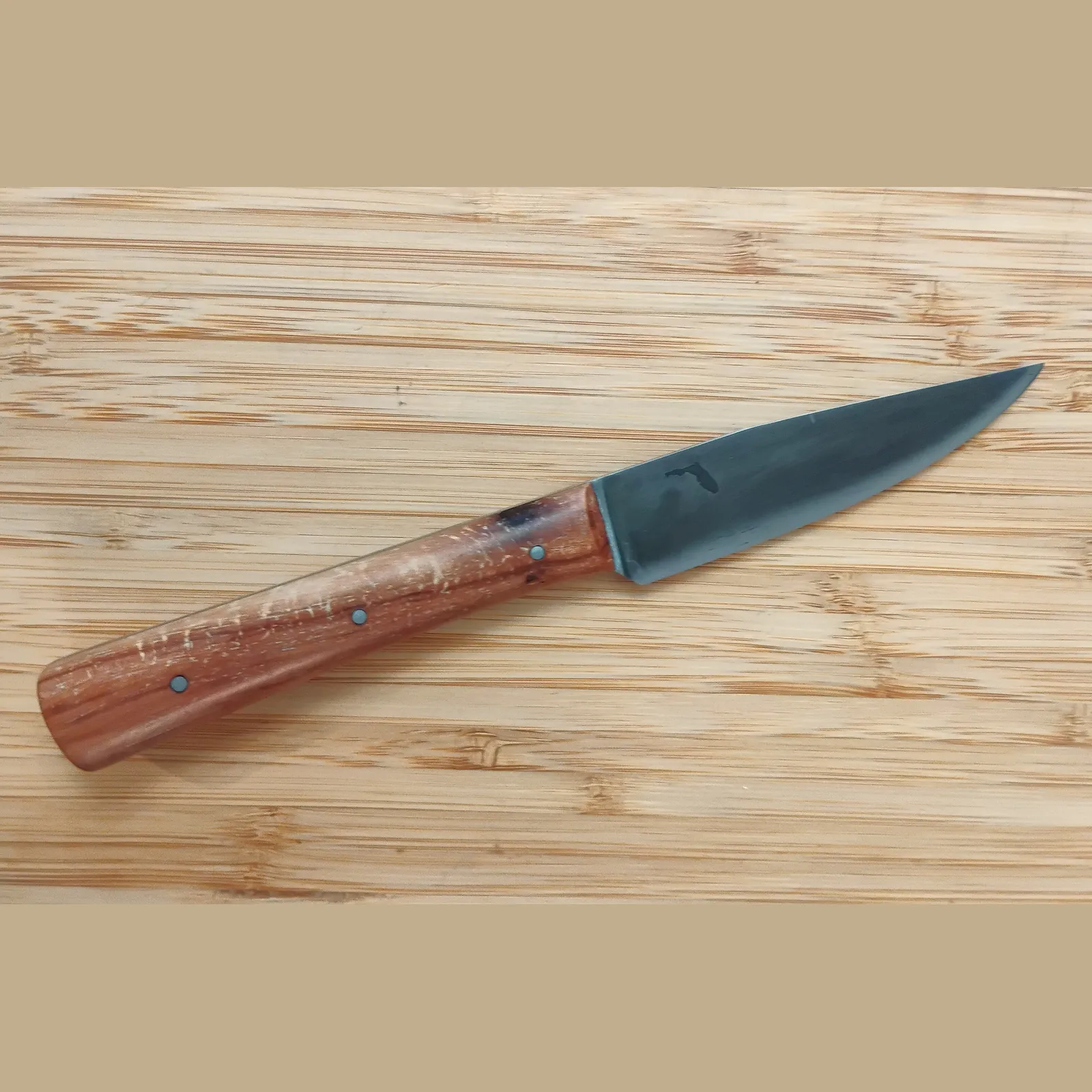 These blades are forged from high-carbon steel, not stainless. High-carbon steel will rust if left wet, but the antiqued patina provides protection that deepens with age. To keep the knives performing beautifully: