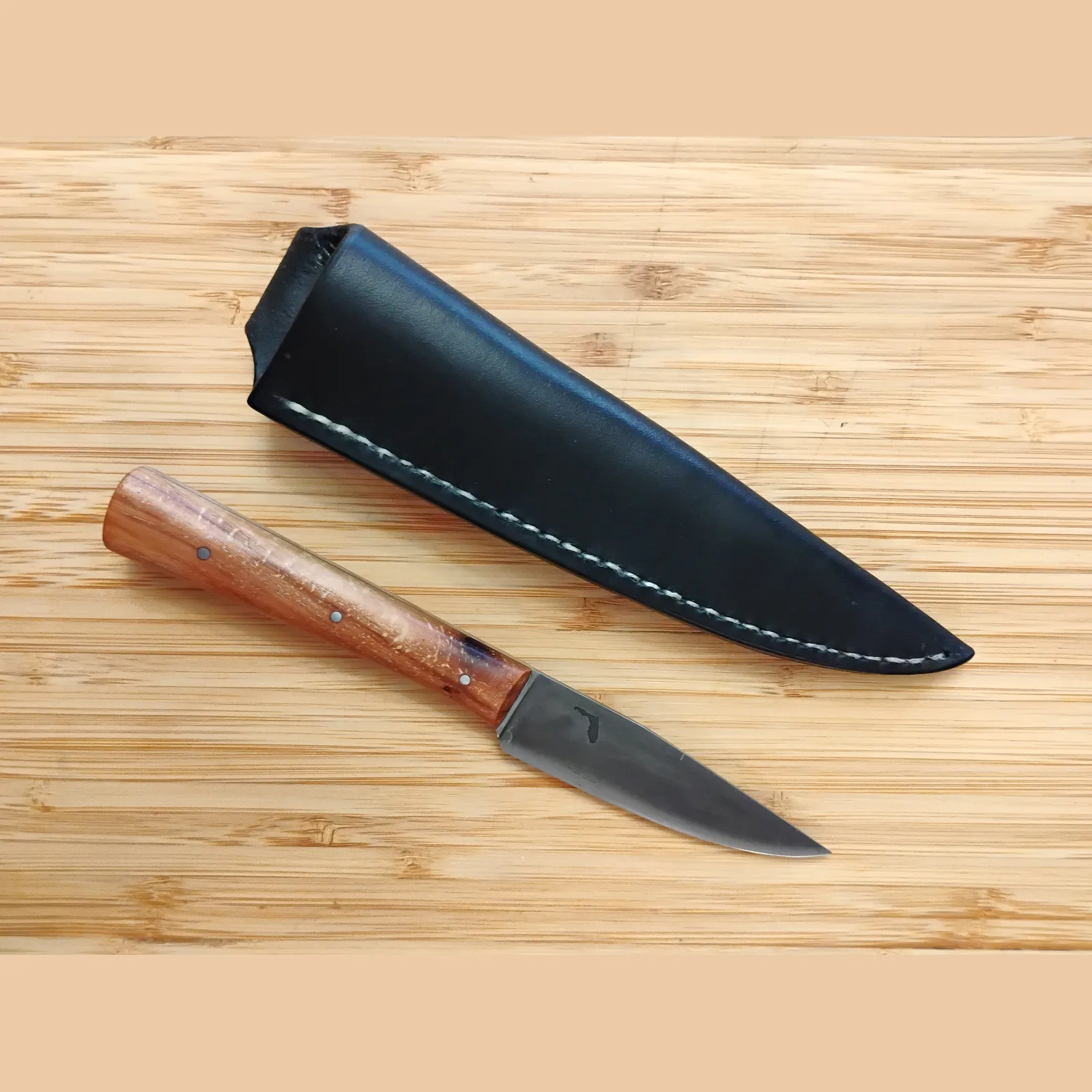 Protect your Pecan Tiny Trade Knife with a custom pouch-style sheath, hand-cut from veg-tanned leather and dyed with Greg’s shop-brewed vinegaroon dye for a deep black finish. Becky stitches each sheath by hand with durable linen thread—a period-correct choice that has stood the test of time. She burnishes the edges smooth and finishes the leather with beeswax for lasting water resistance. These steps echo 19th-century techniques while ensuring your sheath will hold up through years of daily use. Learn more in our Historic Leather Dyes blog series.