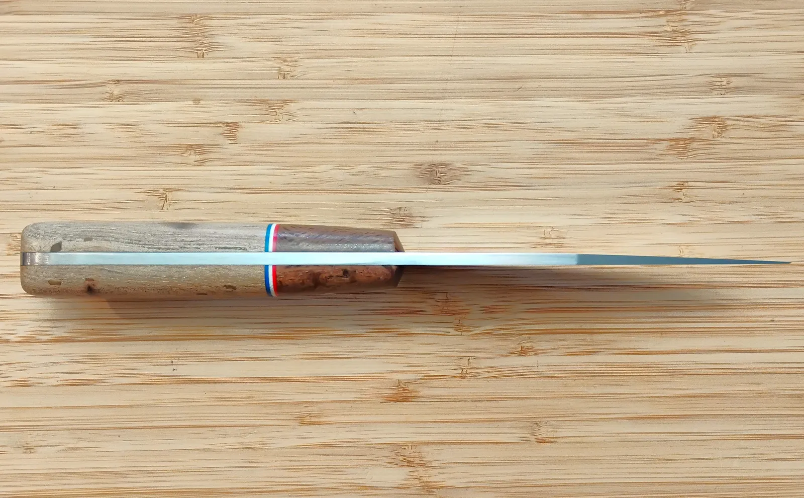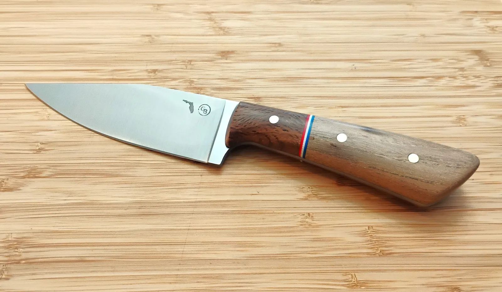 - Handle: Stabilized FL Pignut Hickory scales, stabilized FL Live Oak bolster, red/white/blue G10 spacers, brass pins