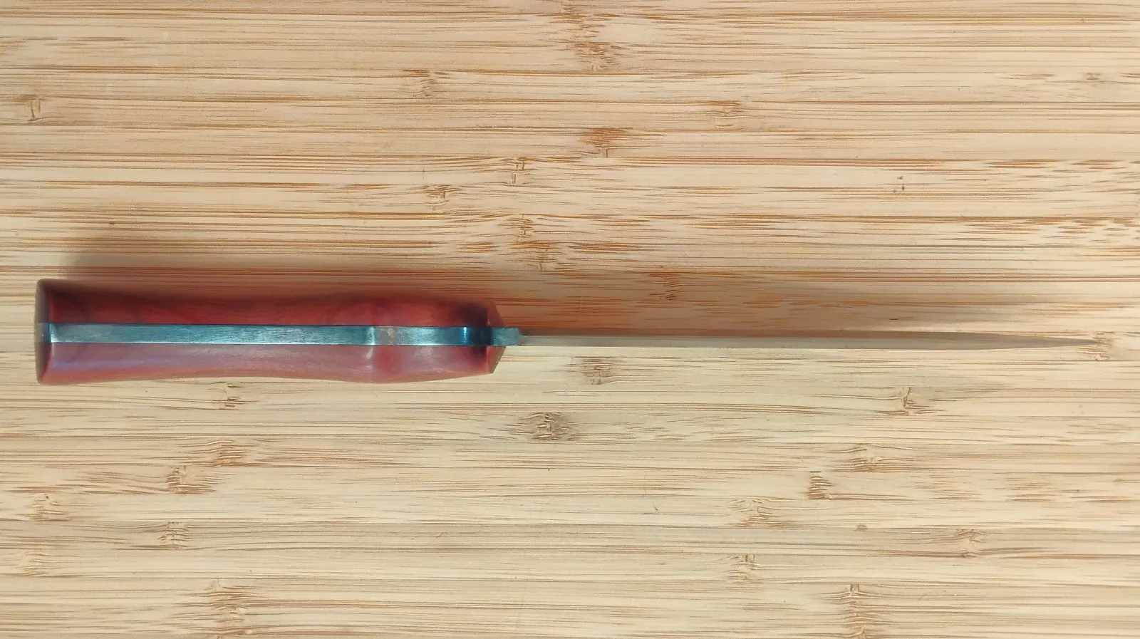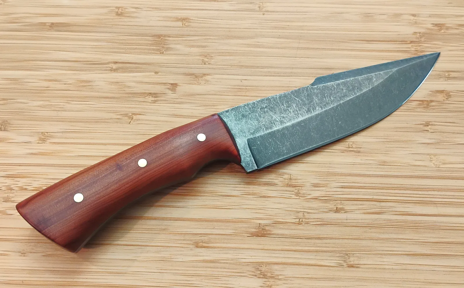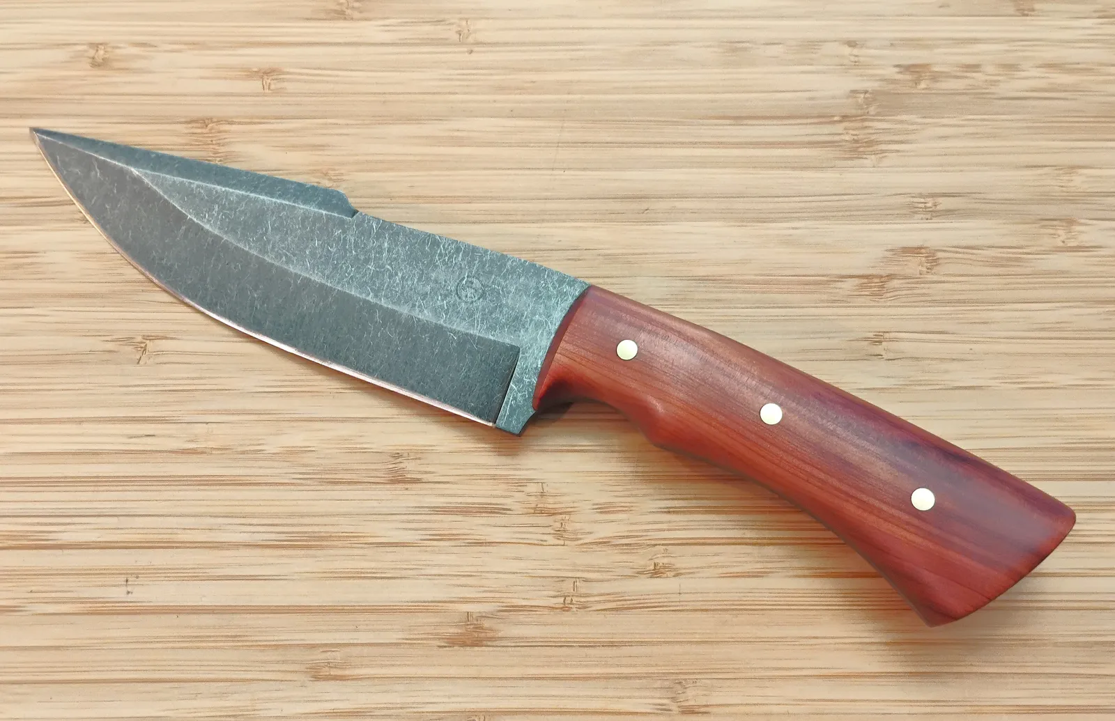The handle is made from stabilized Florida Red Cedar, harvested and worked by Greg himself. Each piece of wood displays unique grain and rich red tones. For this reason, no two knives look exactly alike. Brass pins secure the handle and provide long-term durability. At the same time, the handle shape offers a comfortable and confident grip that balances the blade’s weight.