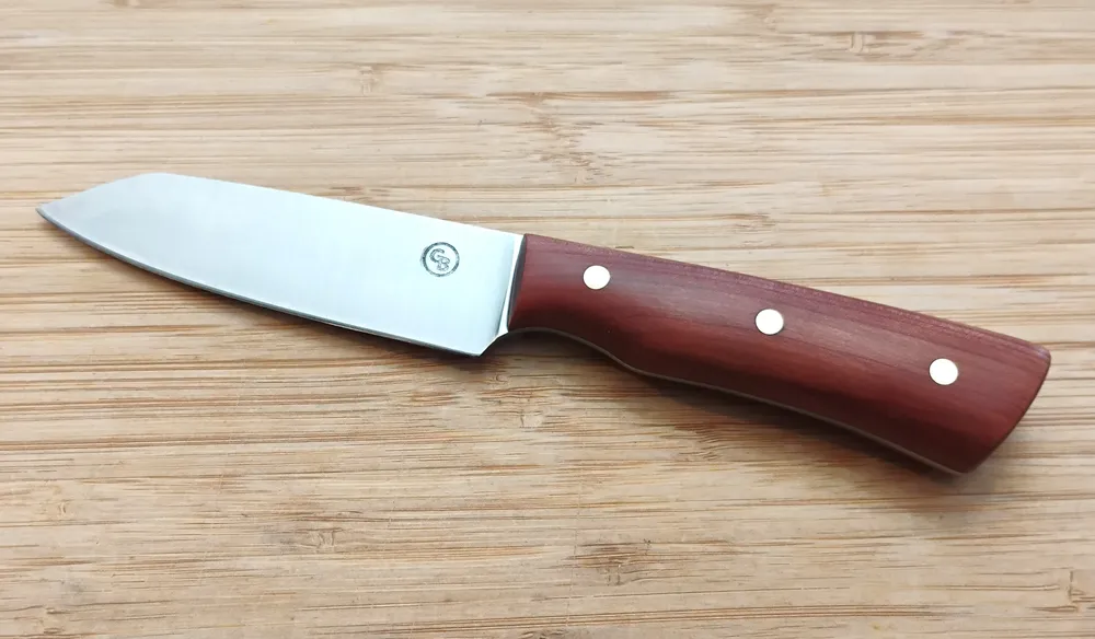 The Red Cedar Paring Knife is an essential tool for any kitchen.  This tool blends style and performance. Its 1095 high carbon steel blade ensures lasting sharpness. Also, the modified santoku/sheepsfoot design allows for precise cuts with excellent control. Moreover, the stabilized Florida Red Cedar handle adds a touch of natural elegance, making it a standout piece for culinary enthusiasts. This knife was specially designed for a custom order at the DeLand Artisans Market on May 16, 2025, and is now available for pre-order only. For that reason, it’s a rare opportunity to own a piece of Greg’s latest design.