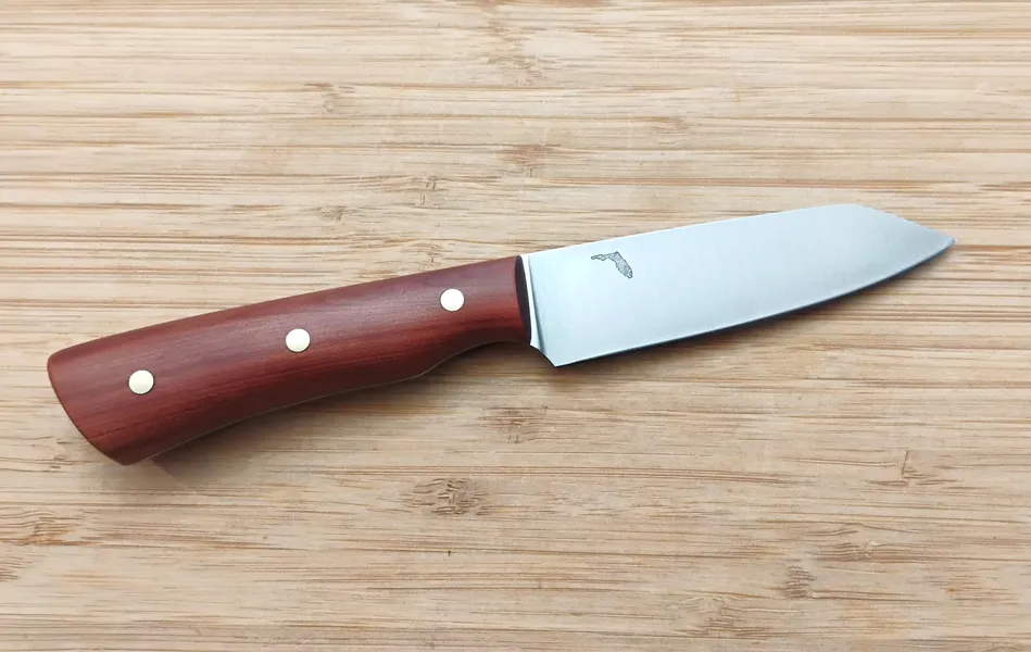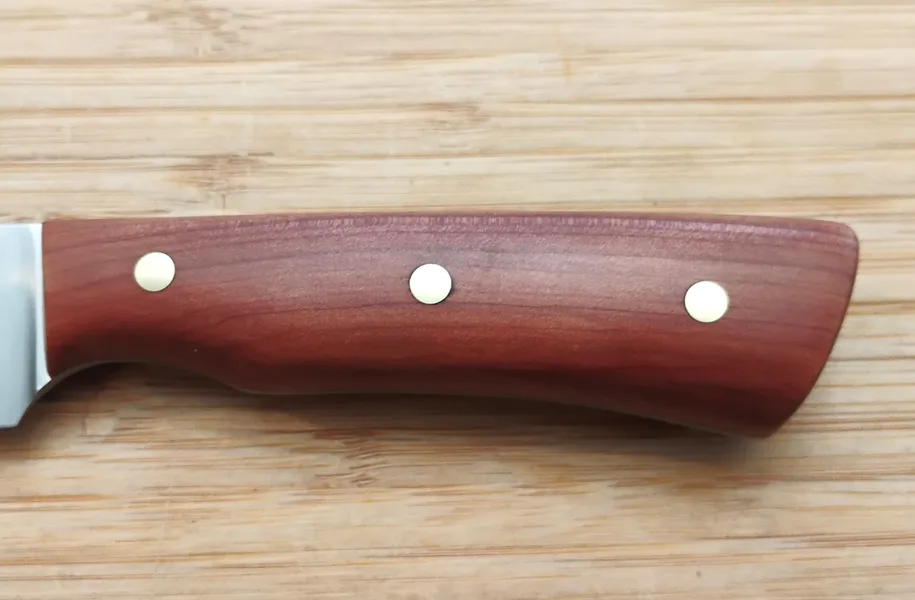 As part of our Florida Wood Series, the Red Cedar Paring Knife showcases a handle crafted from stabilized Florida Red Cedar, secured with brass pins for a comfortable grip. This series highlights Florida woods like Red Cedar and Live Oak, each with a unique story of local heritage. Learn more about this legacy on our Florida Woods Series page.  The Red Cedar handle, explored in our detailed post, not only provides a beautiful aesthetic that complements any kitchen but also ensures durability for daily use.Perfect for both professional chefs and home cooks, this knife combines traditional craftsmanship with modern functionality.