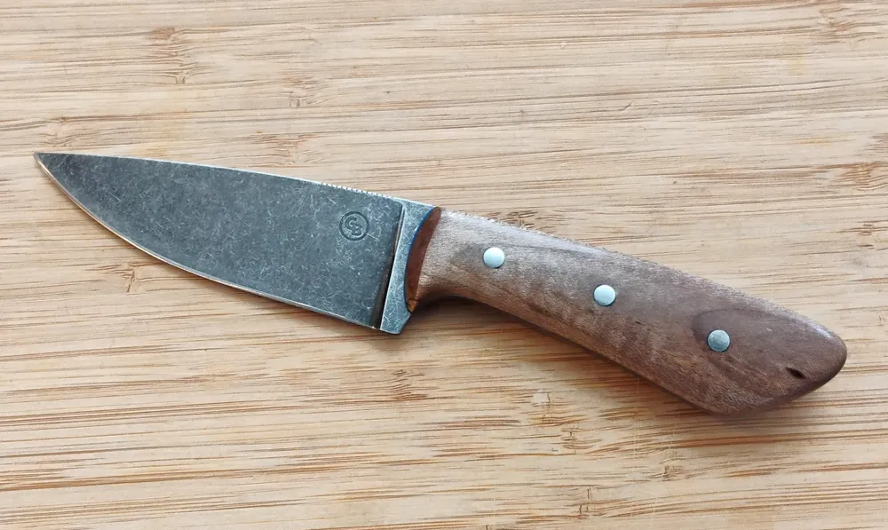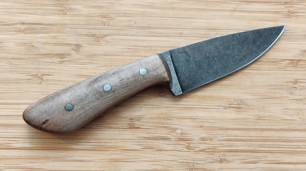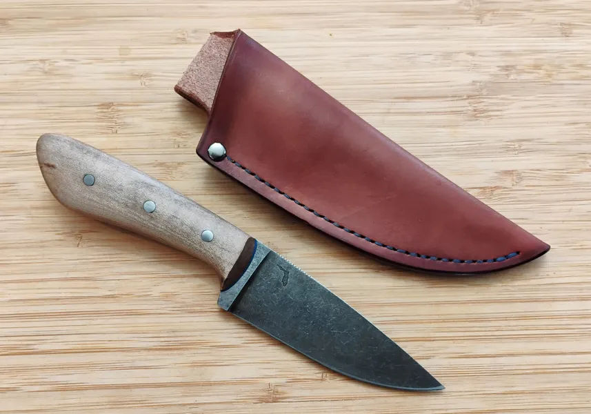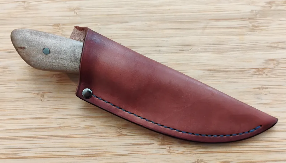 For example, the handle, crafted from stabilized Florida red maple paired with vibrant blue G10 liners, delivers a comfortable, secure grip that reflects GreBec Knives’ commitment to craftsmanship. Sourced from local Florida red maple, the wood is stabilized to withstand humidity, ensuring longevity in diverse conditions. The blue G10 liners add a bold pop of color, making this knife as eye-catching as it is practical. It comes paired with a custom-made, hand-cut, and dyed pouch sheath, the Red Maple Drop Point is a reliable companion for hunting, daily chores, camping, or crafting.